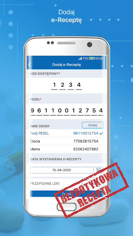 BEZDOTYKOWA RECEPTA - Już nie musisz w aptece na głos wypowiadać numeru PESEL i PIN do e-Recepty. Po prostu pokaż kod na ekranie telefonu. Recepta wcale nie musi być tylko Twoja. Może być mamy, taty albo sąsiada, któremu pomagasz w tych trudnych czasach.