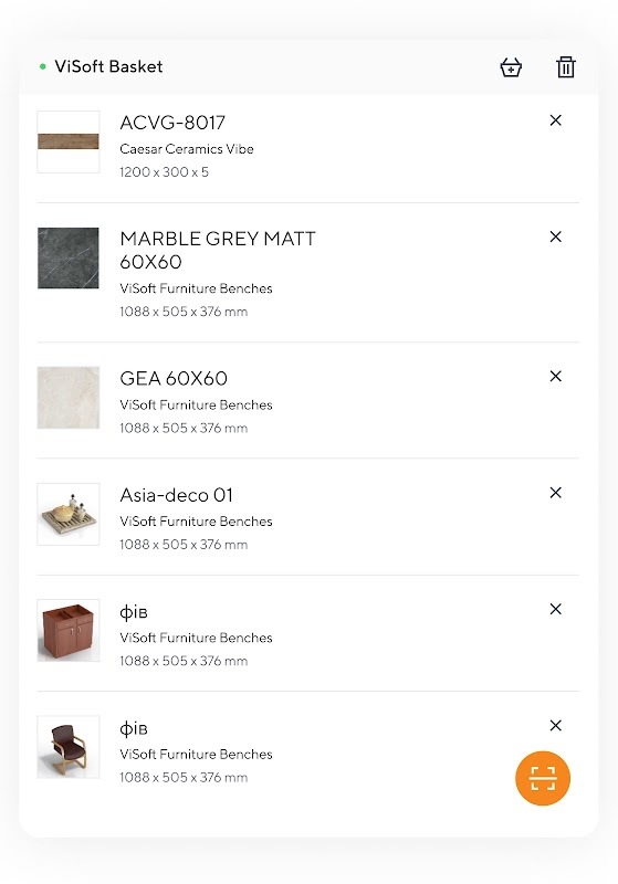 Di ruang pamer, cukup memindai kode QR ubin favorit Anda menggunakan Aplikasi ViSoft Basket di perangkat seluler Anda. Kemudian impor pilihan ubin Anda di ViSoft Premium dengan memindai kode-QR di Keranjang QR program. Keranjang QR Premium ViSoft Anda akan menampilkan ubin yang Anda pilih. Sekarang Anda dapat menggunakan ubin yang dipilih untuk perencanaan pelanggan individu.