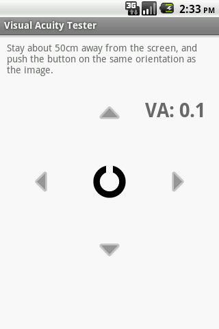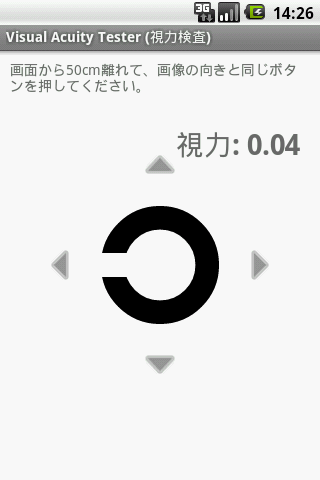 Stay about 50cm away from the screen, and push the button on the same orientation as the image. Measurement VA is approximate value. 1.0 corresponds to 20/20 or 6/6.