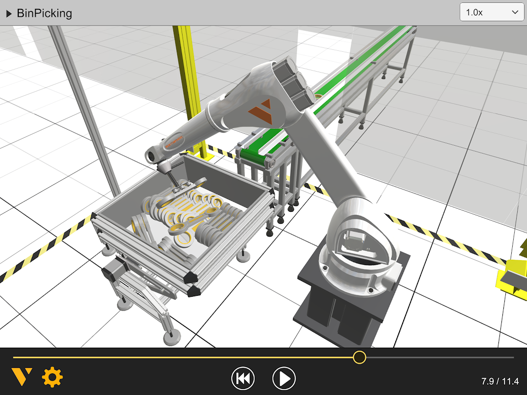 Anda dapat dengan mudah menavigasi di dalam tata letak dengan kontrol layar sentuh dan dengan fitur dual touch zoom in dan out yang sederhana, Anda dapat melihat lebih dekat sel robot atau menonton simulasi semua proses Anda dari pandangan mata burung. Rotasi satu sentuhan memungkinkan Anda melihat simulasi dari berbagai sudut.