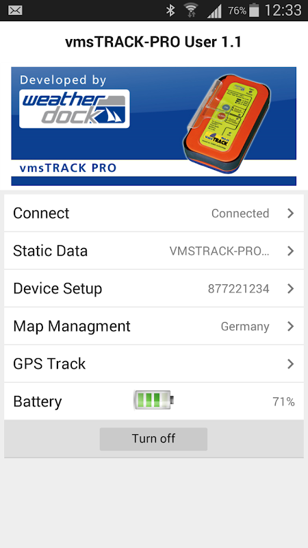 Aplikasi ini memungkinkan Anda untuk membaca-out vmsTRACK-PRO via Bluetooth. Anda dapat menampilkan data statis dan status baterai. The vmsTRACK adalah pemancar yang digunakan untuk layanan manajemen kapal atau pelacakan kapal kecil seperti kapal nelayan. The vmsTRACK adalah transmisi track GPS secara teratur melalui VHF. Selain itu lagu ini juga disimpan dalam memori flash internal. Dengan aplikasi ini Anda juga dapat membaca-out trek ini dan menampilkannya pada GoogleMaps (TM).
