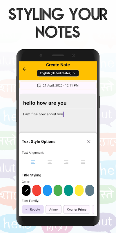 Aplikasi ini mendukung transkripsi suara multibahasa, memungkinkan pengguna mendiktekan catatan dalam berbagai bahasa termasuk Inggris, Spanyol, Prancis, Jerman, Italia, Portugis, dan banyak lagi. Anda dapat menyesuaikan catatan Anda dengan font, perataan, dan warna teks yang berbeda menggunakan fitur gaya bawaan, sehingga memudahkan pemformatan memo suara Anda untuk kejelasan dan personalisasi.