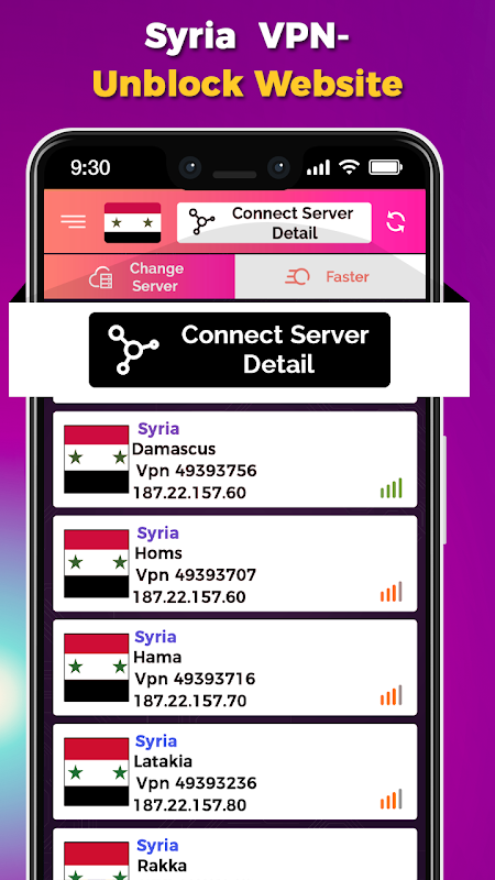 browsing with VPN Syria-Unblock Website is the fastest network of any Syria country. Find all latest information like news, videos and many more sites related to Syria country. An application can particularly design considering the Intuitive User Interface while using it. your device and network are safe to use while you using or connected with any servers.