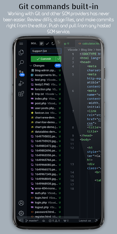 🚀 Kode seperti pro dengan VScode untuk Android - editor kode terbaik sekarang 📱tersedia di perangkat seluler Anda! Aplikasi canggih ini menghadirkan semua fleksibilitas dan fungsionalitas versi desktop Visual Studio Code (v1.76.1) langsung ke ujung jari Anda. Tulis, edit, dan debug kode saat bepergian, di mana pun Anda berada.