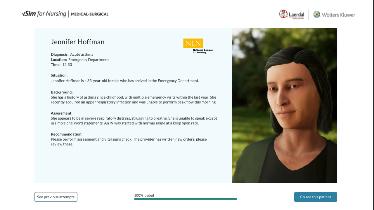 Kembangkan keterampilan penilaian klinis, kompetensi, dan kepercayaan diri dalam keperawatan melalui vSim® for Nursing, dikembangkan bersama oleh Laerdal Medical dan Wolters Kluwer.
