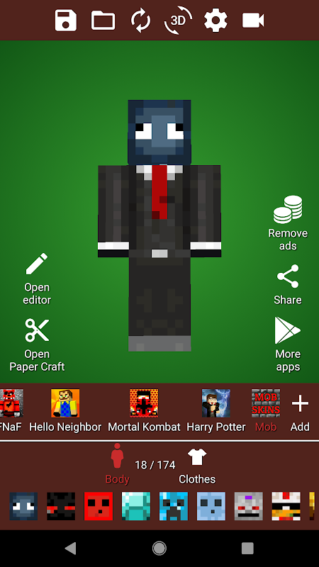 Jelajahi kulit yang dibuat dalam mode 3D, dengan kemampuan untuk menyimpan kulit dalam posenya.