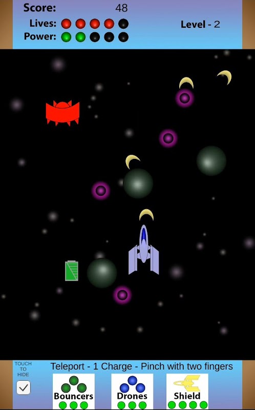 Shoot and move in Warp Speed, a fast paced shoot ‘em up where you control the ship with your finger to dodge and weave through enemy shots. Utilize an arsenal of powers available to you, including shot reflectors, invincibility, and drones to defeat enemy ships and the bosses that follow them.