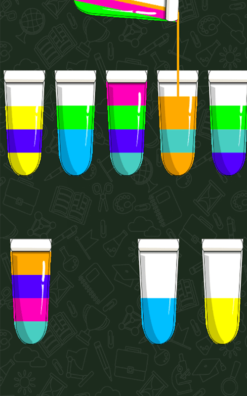 Jumlah tabung dan cat air bertambah di setiap level game. Terapkan keterampilan bermain Anda untuk menyusun warna yang sama dalam satu gelas dan game.