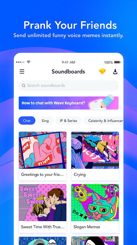 Have you tired with your old way to chat with your friends? Now Wave will help you try a new way to chat. Everything in WAVE is handled. You can send voice memes and different sound effects to your friends directly in keyboard (available on WhatsApp, Instagram, Snapchat and Messenger), come and prank your friends.