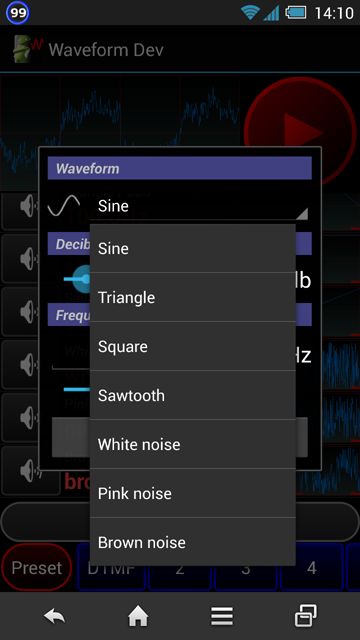発信できる波形は、正弦波、三角波、矩形波、ノコギリ波、ホワイトノイズ、ピンクノイズ、ブラウニアンノイズの7種類です。