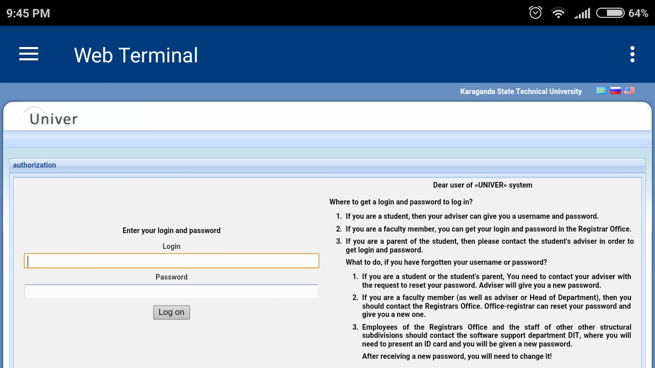 Aplikasi "Web Terminal KSTU" menyediakan cara yang nyaman untuk menggunakan sumber daya dari Technical University Karaganda Negeri di fungsinya mencakup kemampuan untuk melihat jadwal kelas dan evaluasi siswa melalui antarmuka web. Dan banyak lagi: