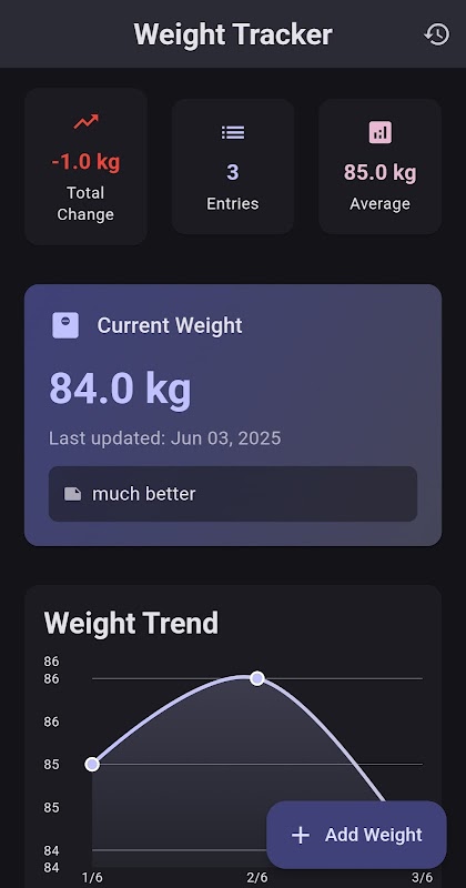 Weight Tracker adalah aplikasi yang dirancang dengan indah dan intuitif yang membuat pemantauan kemajuan berat badan Anda menjadi mudah dan memotivasi. Baik Anda sedang dalam perjalanan kebugaran, mengelola kesehatan, atau sekadar memperhatikan perubahan tubuh Anda, aplikasi kami memberikan keseimbangan sempurna antara kesederhanaan dan wawasan yang kuat. ✨ Fitur Utama