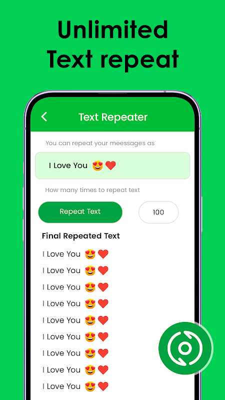 Tambahkan sentuhan menyenangkan pada pesan Anda dengan Pengulangan Teks. Ulangi teks dan emoji secara kreatif. Nikmati fitur unik ini dengan bertanggung jawab.