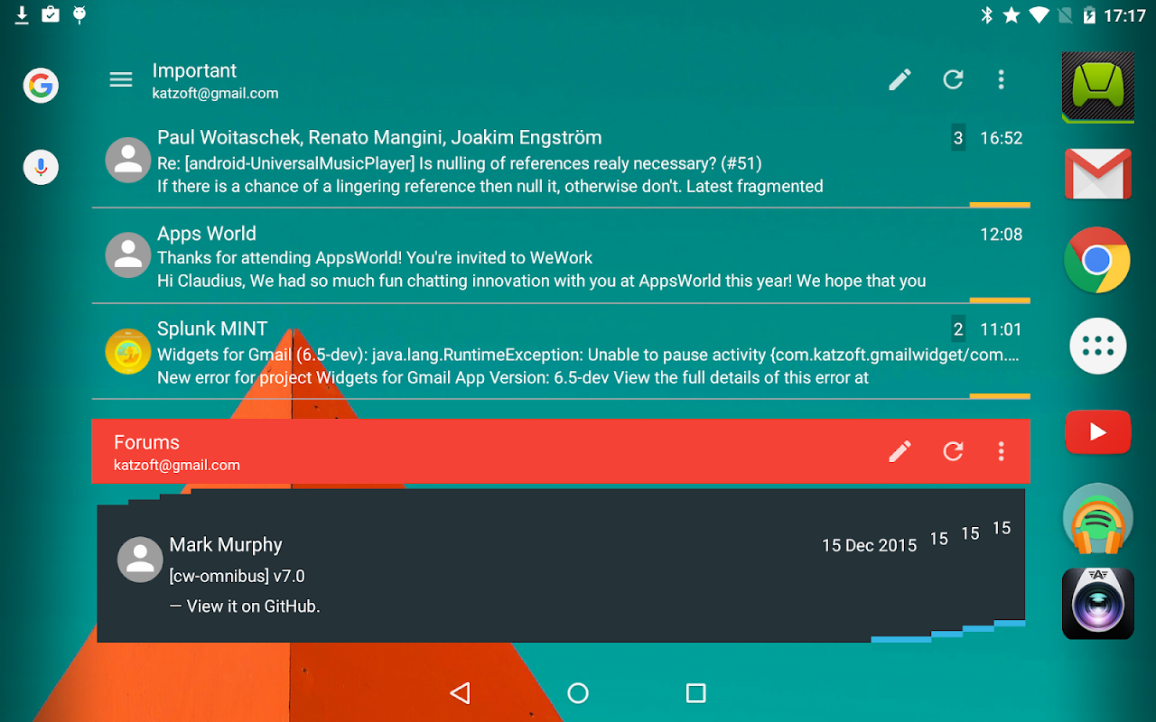 Widgets for Gmail is an easy to use collection of beautiful home screen widgets in a variety of sizes - from icons to large widgets - that show an unread count of email, SMS / text messages and calls as well as previews (sender, subject and content). It can aggregate messages from different sources into a merged (combined) inbox.