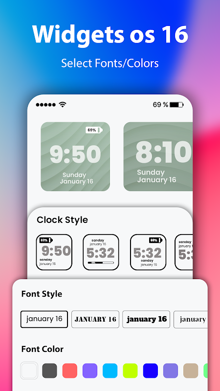 Widget !OS 16 - Color Widget memungkinkan Anda menambahkan tiga widget: Kecil, Sedang & Besar, dengan banyak font dan warna untuk disesuaikan.