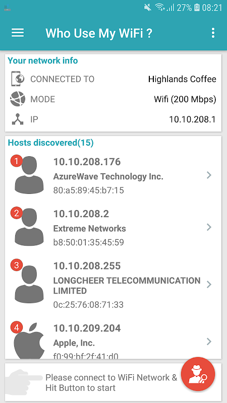 Menggunakan Detect yang menggunakan wifi saya, dalam beberapa saat anda tahu berapa banyak dan peranti mana yang disambungkan ke router anda dengan IP, ID MAC dan penyenaraian penjual.