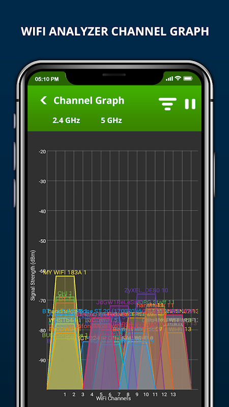 Menunjukkan saluran Wi-Fi di sekitar Anda Wi-Fi Analyzer - Network Analyzer membantu Anda menemukan saluran yang kurang ramai untuk router Wi-Fi Anda. Network Analyzer digunakan untuk mengoptimalkan Jaringan Wi-Fi dengan memindai kekuatan sinyal, sinyal yang penuh sesak dan peringkat Saluran Wi-Fi. Wi-Fi Analyzer adalah Alat Profesional Internet Nirkabel, yang menyediakan analisis Wi-Fi dan uji kecepatan, daftar sinyal Wi-Fi dan perangkat pemindaian super di bawah Wi-Fi, dan juga memiliki fungsi pengaturan router.