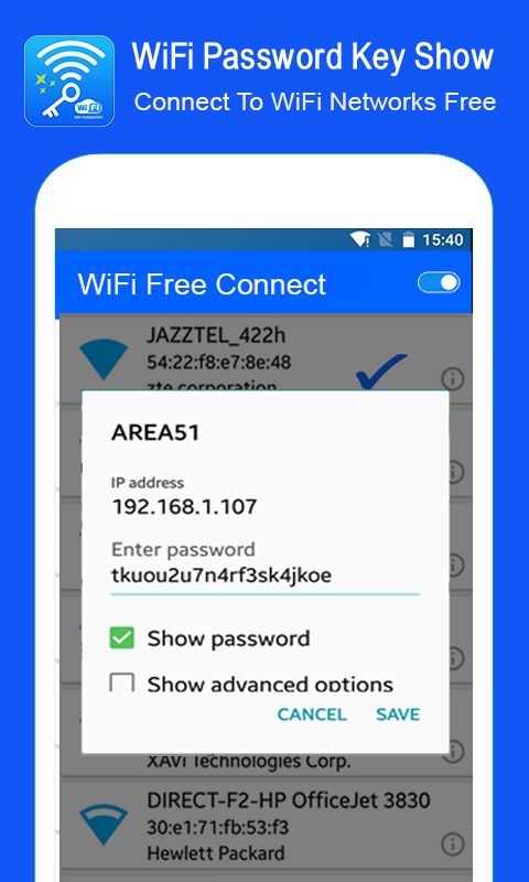 Wifi Password Show adalah alat berguna yang membantu Anda melakukannya dengan mudah dan nyaman. Dengan hanya beberapa langkah Anda dapat dengan mudah melihat kunci kata sandi wifi Anda dan dapat membagikan kata sandi Anda dengan teman-teman Anda dengan mudah. Wifi Manager menunjukkan titik Akses WiFi, saluran di sekitar Anda & frekuensinya, SSID, dan kata sandi wifi. Pulihkan semua kata sandi jaringan terhubung nirkabel yang pernah Anda hubungkan dengan bantuan tampilan kunci kata sandi wifi.