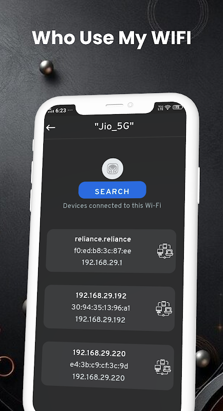 6. **Siapa yang Menggunakan Wi-Fi Saya?**: Lacak semua perangkat aktif di jaringan Anda, membantu Anda memastikan bahwa hanya perangkat tepercaya yang terhubung. Pantau perangkat yang terhubung secara real-time untuk meningkatkan keamanan jaringan.