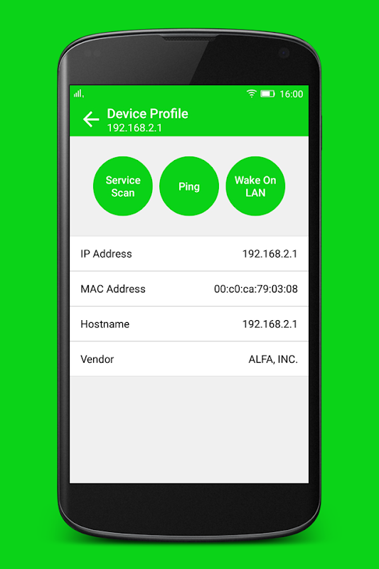 The app finds intruders on your wireless network. The app shows you exactly who is connected to your network right now. It shows the details such as IP address, manufacturer, device name and Mac Address. The app offers scan services, ping and wake on LAN services for the connected devices. Further, app provides standard diagnostic tools to view send/receive data usage and other network information.