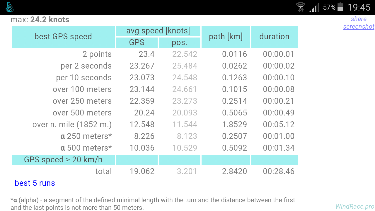 ● Best speed segments for the mentioned speeds. The set of segments includes best moments, best 2 points, best 2/10 seconds/1 hour, best 100/250/500 meters and nm, alpha speed for 250/500 meters and 5 best runs per each segment;