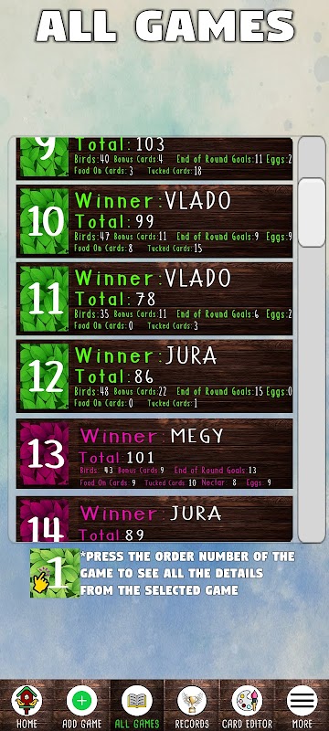 Bagian penting dari aplikasi ini juga adalah kemampuan untuk melacak berbagai catatan yang diperoleh dari game kehidupan nyata pengguna. Pengguna dapat melihat dua jenis catatan. Catatan "Per pemain" akan menunjukkan kepada pengguna total poin, kemenangan, poin rata-rata, dan lainnya untuk pemain tertentu, sedangkan catatan "Semua permainan" akan memberi pengguna skor tertinggi, poin, kemenangan, persentase kemenangan, dan banyak lagi dari semua permainan yang dimainkan. permainan.