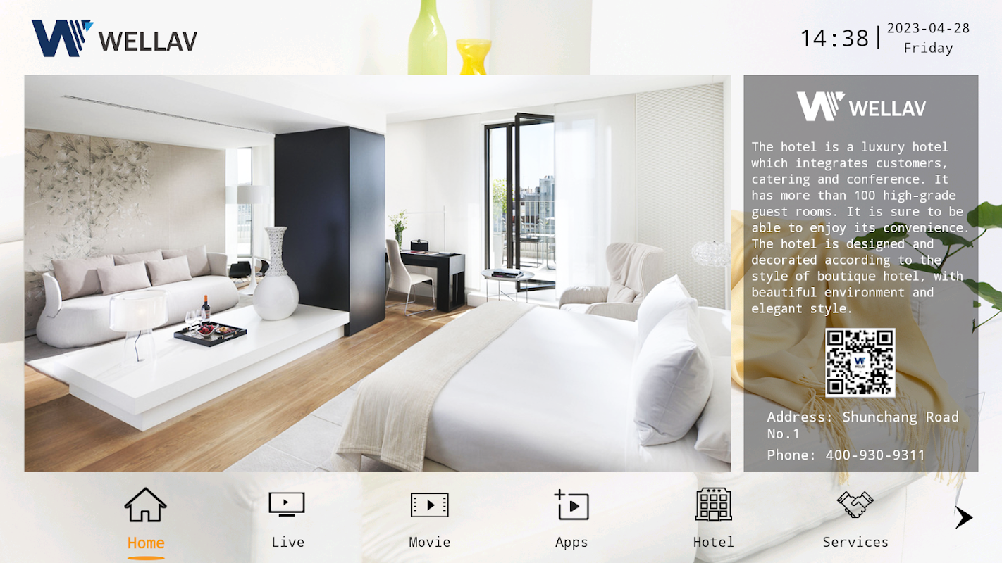 Ini adalah perangkat lunak aplikasi IPTV hotel yang mendukung siaran langsung waktu nyata, fungsi antarmuka penyesuaian poster, dan juga mendukung informasi pelanggan check-in hotel untuk menampilkan kata-kata sambutan