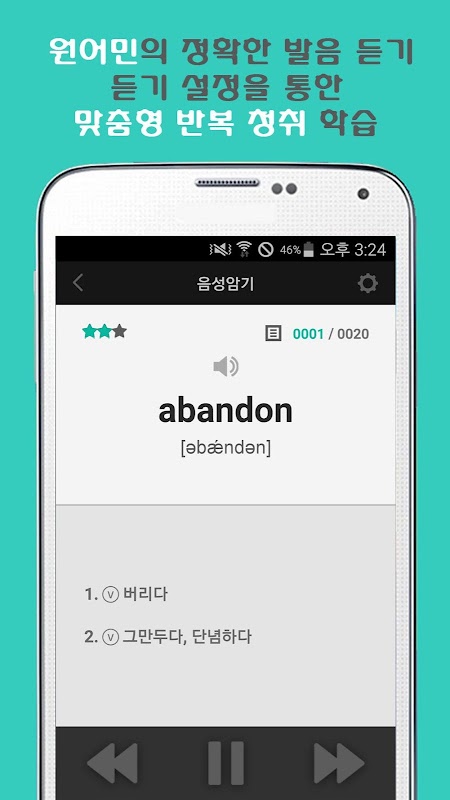 총 1000단어에 대한 원어민 음성을 통해 정확한 발음 듣기는 물론 반복 청취 학습 및 암기가 가능합니다. 또한 듣기설정을 통해 맞춤 듣기 학습이 가능합니다. 자투리 시간을 활용하여 영단어를 학습하세요!
