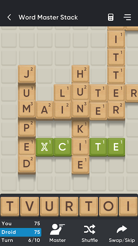 Bangun kata-kata di papan permainan yang diberi kisi-kisi dengan menumpuk ubin huruf di samping atau di atas ubin yang sudah ada di papan.