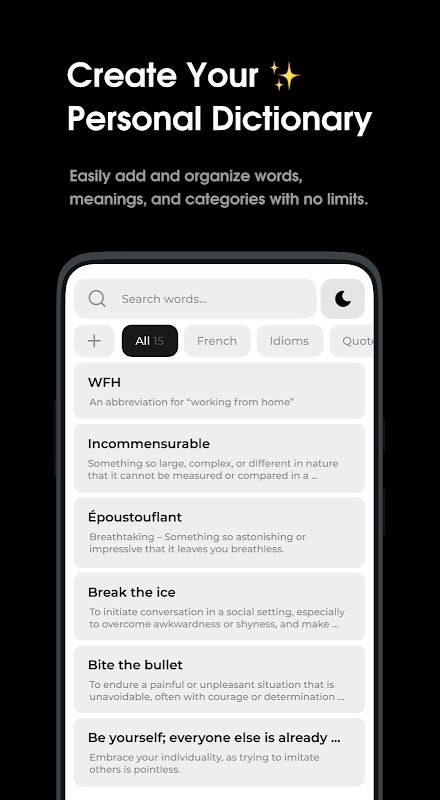 Catatan kata adalah aplikasi penghemat kata yang membantu Anda menghafal kata dan frasa yang Anda tambahkan. Buat kamus pribadi Anda, dan hafalkan kosakata Anda.