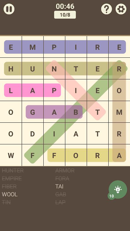 - Hint system for improved gameplay. While you search a word, the game will help you finding the rest of them.