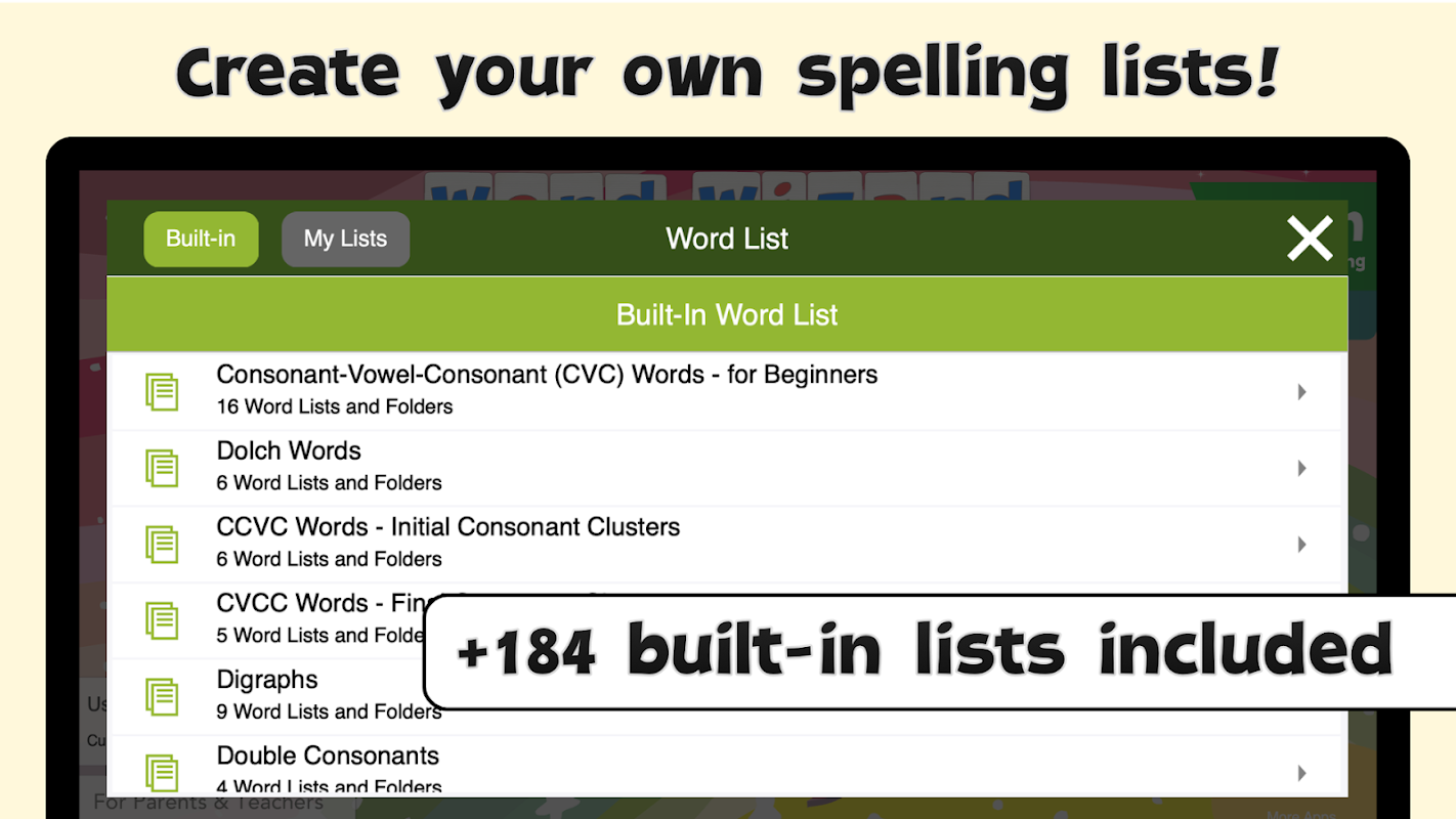 • 184 daftar kata built-in dari 10 kata: Kata untuk pemula, Dolch Words (kata penglihatan), 1.000 kata yang paling sering digunakan, bagian tubuh dan banyak lagi