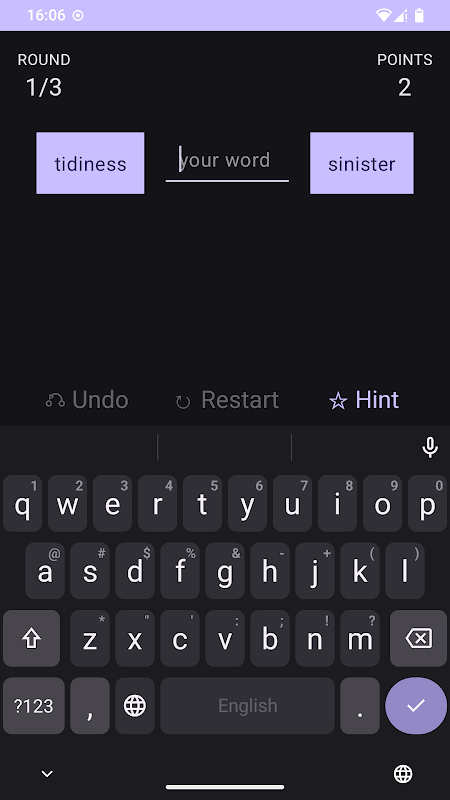 Anda juga dapat menyelesaikan tantangan ini secara terbalik dengan mengubah kata terakhir yang diketahui. Mengetuk kata tersebut akan membuka entri Wiktionary beserta artinya. Menggunakan petunjuk akan mengurangi poin Anda.