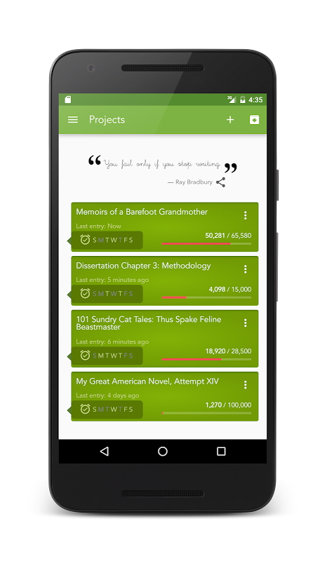 Writing a novel or blog? Finishing a dissertation? Taking on the National Novel Writing Month (NaNoWriMo) challenge? Whatever it is that you're working on, Writeometer gently reminds you to keep going. Let no story languish unfinished, and let no writing project gather dust! It's the perfect pocket companion to help you stay on track to finishing and maintain a daily writing habit. Now go forth, create something every day.