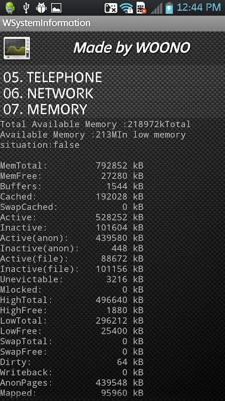 Informasi CPU, Informasi baterai, membangun informasi, jaringan informasi, memproses informasi, konfigurasi jaringan, status jaringan, informasi panggilan, informasi Tugas, informasi disk, dan informasi resolusi, informasi memori, dan aplikasi membantu menunjukkan.