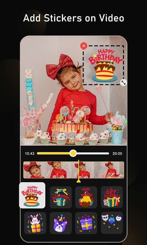 Dalam fitur ini Anda dapat menambahkan stiker dan emoji pada video Anda menggunakan bawaan atau Anda juga dapat mengimpor dari galeri ponsel Anda. Menggunakan fungsi teks pada video ini dapat membuat video Anda terlihat mewah dan bersemangat.