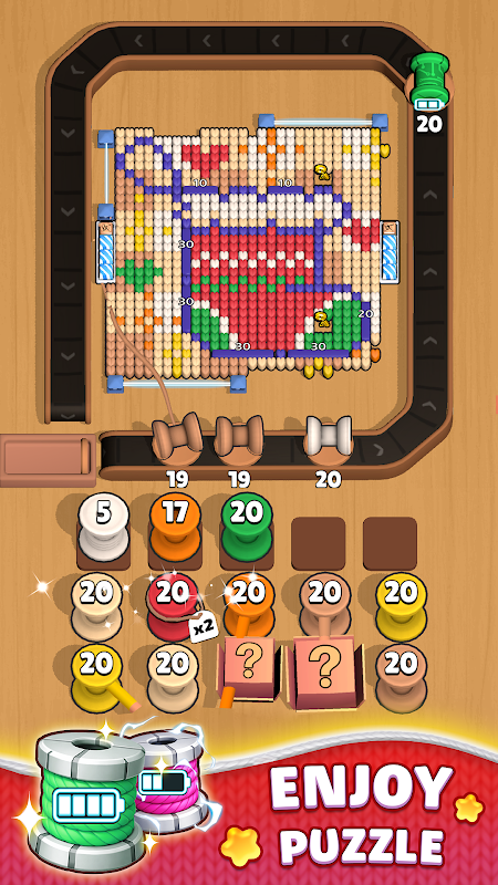 - Angka di atas bola benang menunjukkan jumlah helai yang dimilikinya, sesuai dengan berapa kali bisa digulung. Saat benangnya habis, bola akan keluar dari papan permainan. Jika masih ada benang, bola akan berpindah ke salah satu dari lima slot tunggu. Ketuk lagi untuk mengembalikan bola benang dari slot tunggu dan lanjutkan menarik helai benang di atasnya.