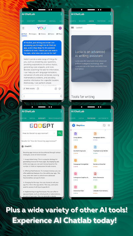 AI ChatLab - Solusi AI Satu Atap. Dapatkan akses ke alat Pemrosesan Bahasa Alami terbaru dan tercanggih dalam satu aplikasi yang nyaman dan bebas iklan. Dari ChatGPT dan YouChat hingga Uminal, Lexii, Komo AI, Andi Search, dan sekarang Whispr, Anda akan memiliki semua kekuatan AI yang Anda perlukan untuk menangani tugas-tugas seperti menjawab pertanyaan, terjemahan bahasa, pembuatan teks, bantuan pengkodean, dan banyak lagi.