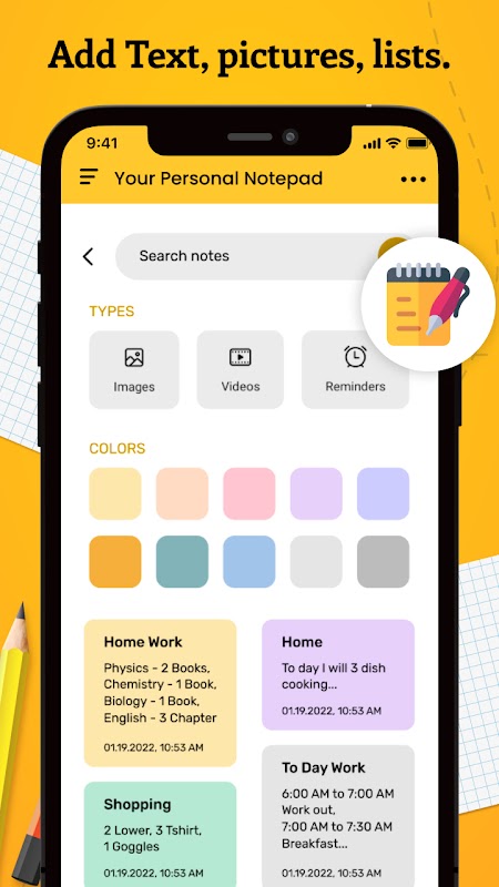 You can create data notes for school, work, shopping, or other usages by using the notepad sticky notes app with a sticky notes memo widget. This colorful notepad app helps you to categorize notes in different tabs.