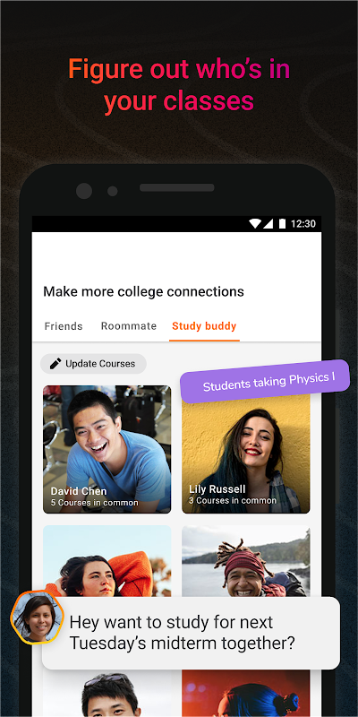 - Teman Belajar: Temukan orang-orang di kelas yang sama dengan Anda atau mengambil kelas yang sama dengan Anda untuk saling membantu mengerjakan pekerjaan rumah, mengoceh tentang kelas, dan banyak lagi. *Saat ini hanya tersedia untuk komunitas perguruan tinggi tertentu