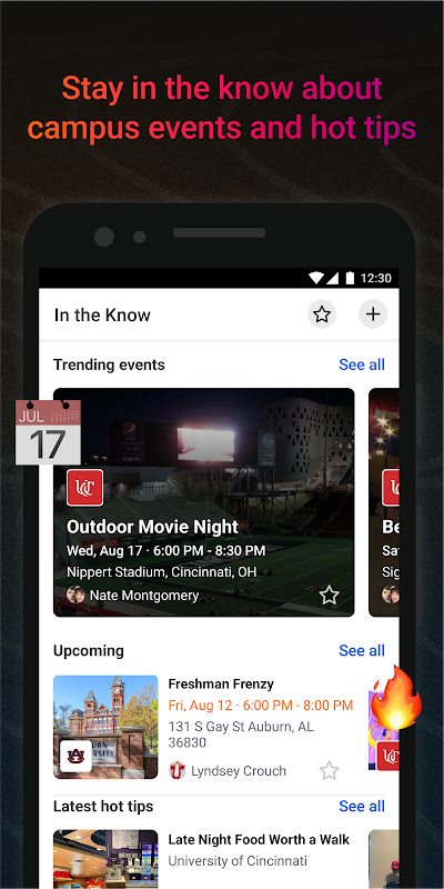 - Acara & Kiat Panas: Jadilah yang pertama tahu tentang acara yang sedang tren di kampus. Baik itu pesta rumah, acara belajar, aktivitas klub, atau acara pribadi, tidak pernah semudah ini untuk menyebarkan berita.