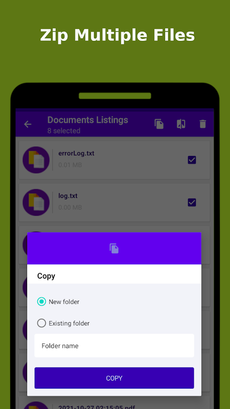 Zip File Extractor memindai dan mengatur file Anda seperti pengelola file. Ekstraktor file memungkinkan Anda memilih file yang akan di-zip dan dikompres untuk meng-unzip arsip seperti Zip, 7z, Tar, Gz, Xz, dan Deflate. Beberapa file dapat dipilih dan ditambahkan dalam folder kemudian folder tersebut diubah menjadi 7z.