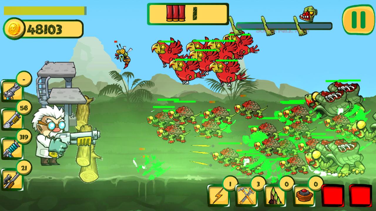 Dia akan menggunakan kecerdasan, kecepatan, kelincahan dan juga para pembantunya - monyet dengan pistol, penguin dengan senjata pembekuan, wombat dengan mortir dan ayam gila dengan senapan anti-pesawat. Apakah mereka dapat menghentikan mutan zombie itu - semuanya tergantung pada Anda. Anda memiliki 12 jenis senjata api (Shotgun, AK47, senapan Sniper, penyembur api, pistol pembekuan, pistol tesla, pistol gravi, senapan anti-tank, dll.). Anda juga dapat menggunakan alat yang berbeda untuk menghentikan serangan monster yang marah. Gabungkan berbagai senjata dan penolong untuk menghancurkan semua mutan. Bersihkan kota, hutan, rawa dan gurun dari zombie.