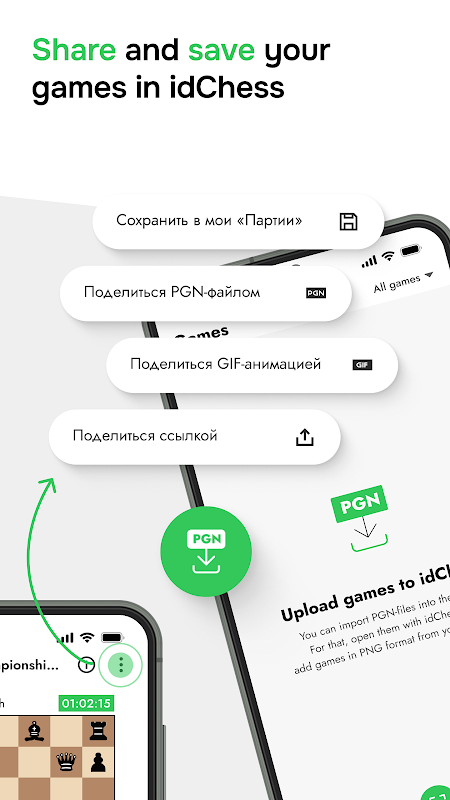 After completion, the game will be saved in the games library in the usual PGN or GIF format for chess players. Also, the app functions as a PGN viewer. The game recording will be available for sending to your coach via any convenient messenger, and it will also be possible to share the recording on social networks. For self-analysis of chess games, the Stockfish engine is built into the idChess mobile app. Even a child can handle the game analysis in the app! idChess highlights strong and weak moves in chess notation and ranks them by points. The app and our digital chess set are great helpers for chess kids, their parents, and coaches. Chess for children has never been so clear! idChess will be a great addition to the game of chess, as well as a chess timer/clock. It can replace a chess computer. Play chess with friends or a coach or analyze mistakes yourself in the idChess mobile app!