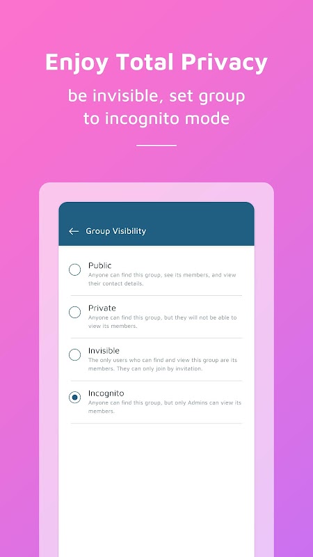 Switch your group to “incognito mode” to keep your messages and data private. Get online without being seen “online”. Group activity is only visible to members sharing the private digital space.