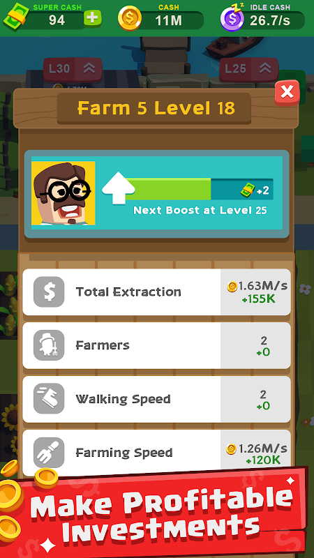 Time to automate the idle farming and grow the most profitable farming empire of the decade. Upgrade your farms and win maximum idle money. Make smart investments into a wide variety of whacky crops and farmers and you'll earn millions and billions in no time. Can you build the most profitable farming business in the planet and be the best Bauer in tapping games?