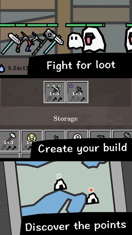 Collect gear and materials as you dig deeper. The deeper you go, the stronger the loot — feel the satisfaction of digging further than yesterday!