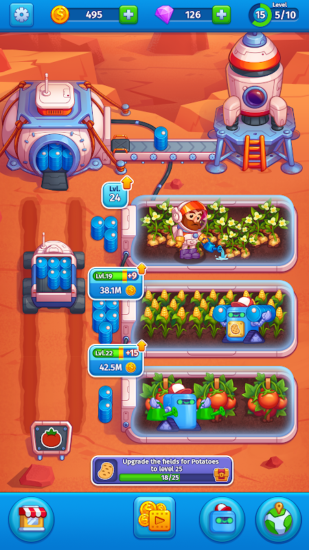 Idle Mars Colony: Clicker farmer tycoon is a free simulator game of the clicker genre, where you can try your hand at being the owner of a space farm. It combines the best aspects of idle tycoon games and farming games. Earn money, automate the work and enjoy the exciting gameplay!