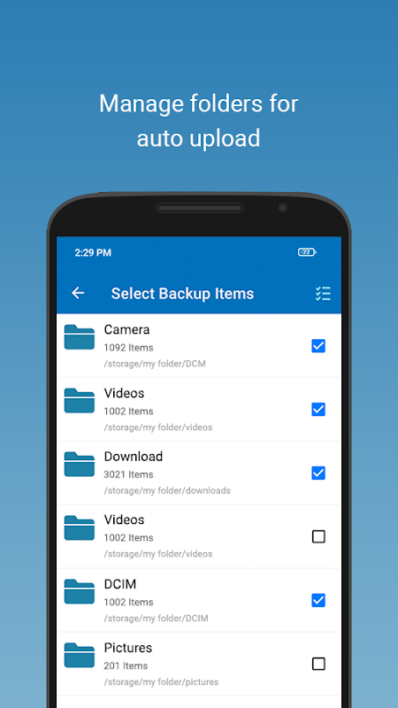 - The Entire phone gallery will be automatically backed up and kept up to date.