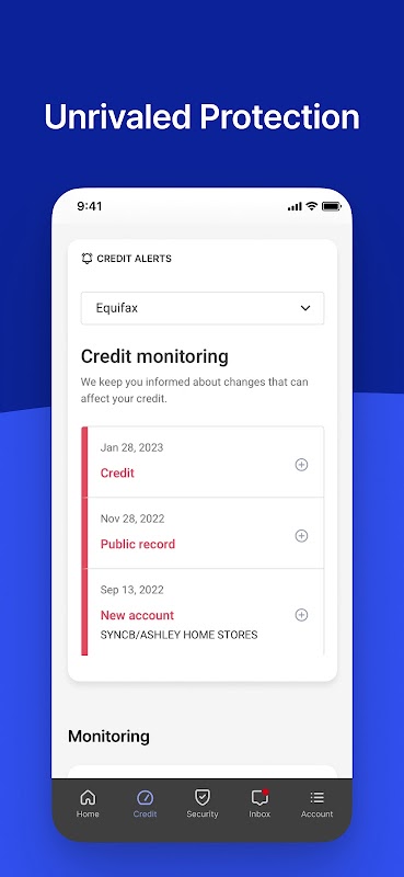 · Main Dashboard to quickly view your current credit score and any new alerts